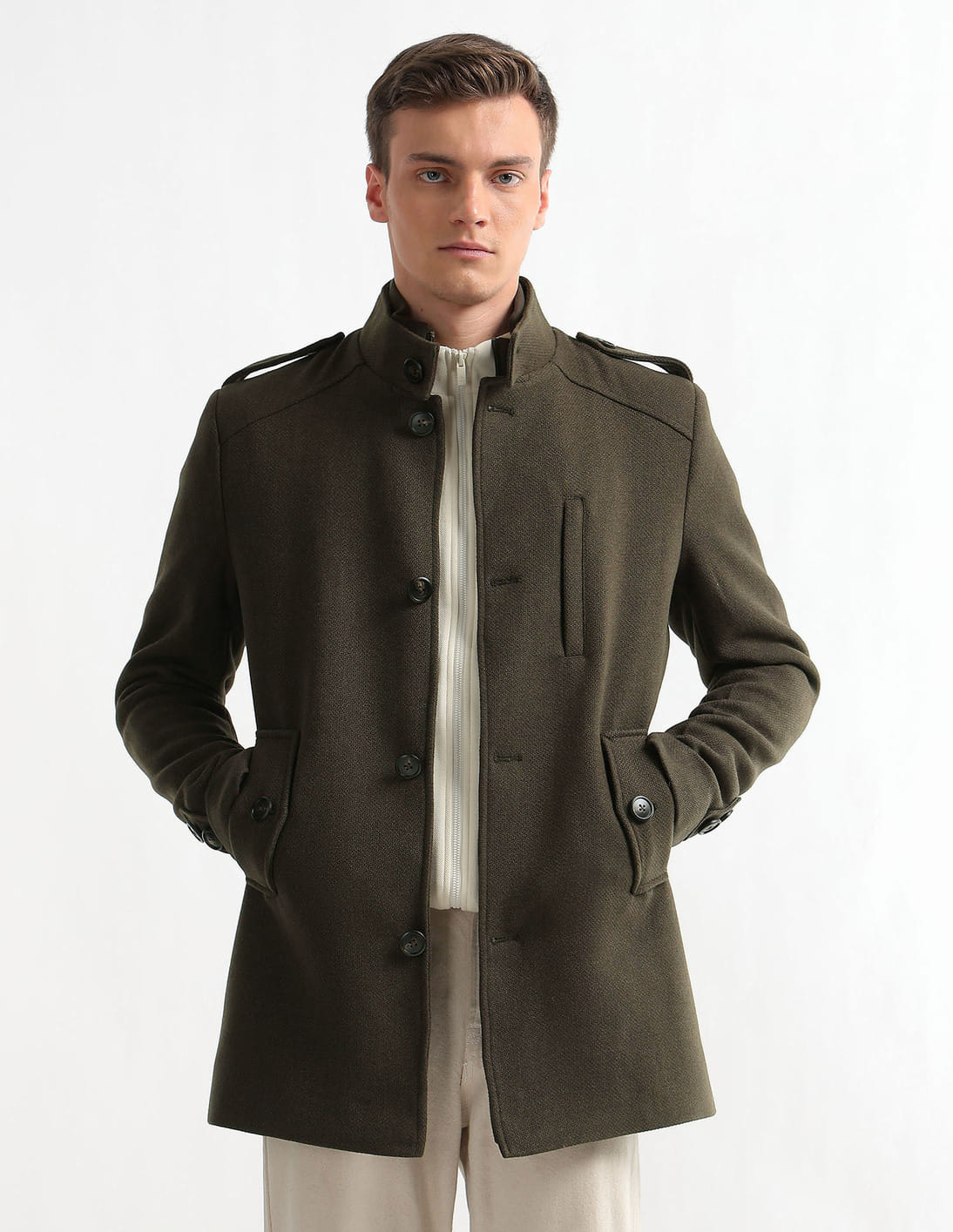 Stand Collar Textured Trench Coat